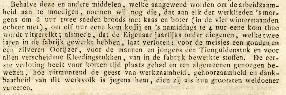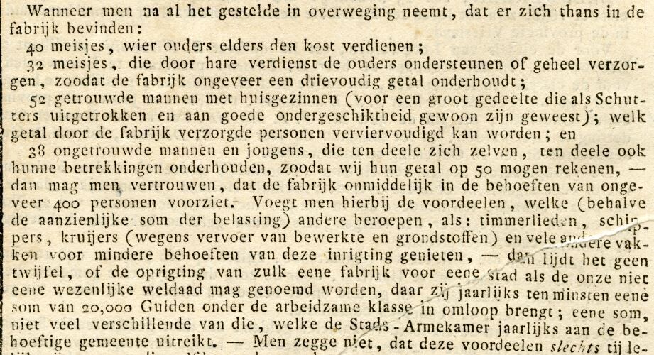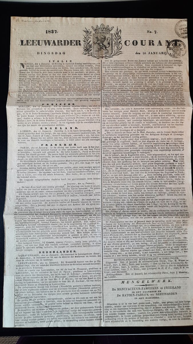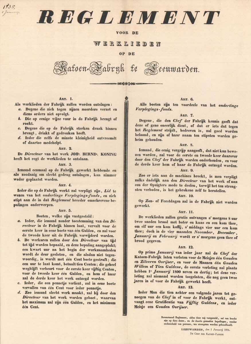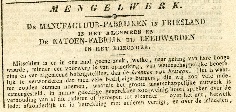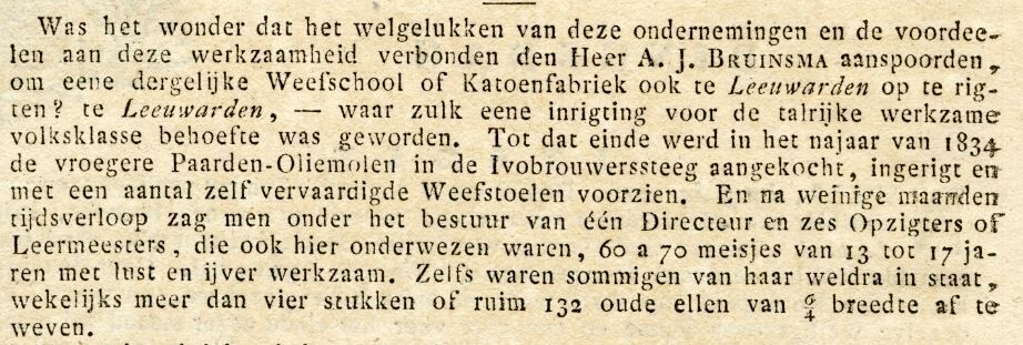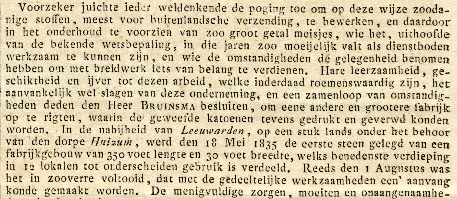 Op dinsdag 21 januari 1837 publiceerde de Leeuwarder Courant een artikel over de katoenfabriek in Leeuwarden. Het had een positieve toon, omdat eigenaar A.J. Bruinsma werk wilde creëren voor de armen in de stad. Zodat de armbesturen ontlast werden van zorg.