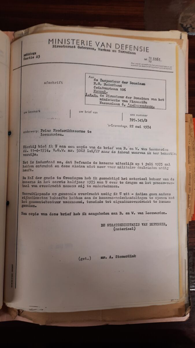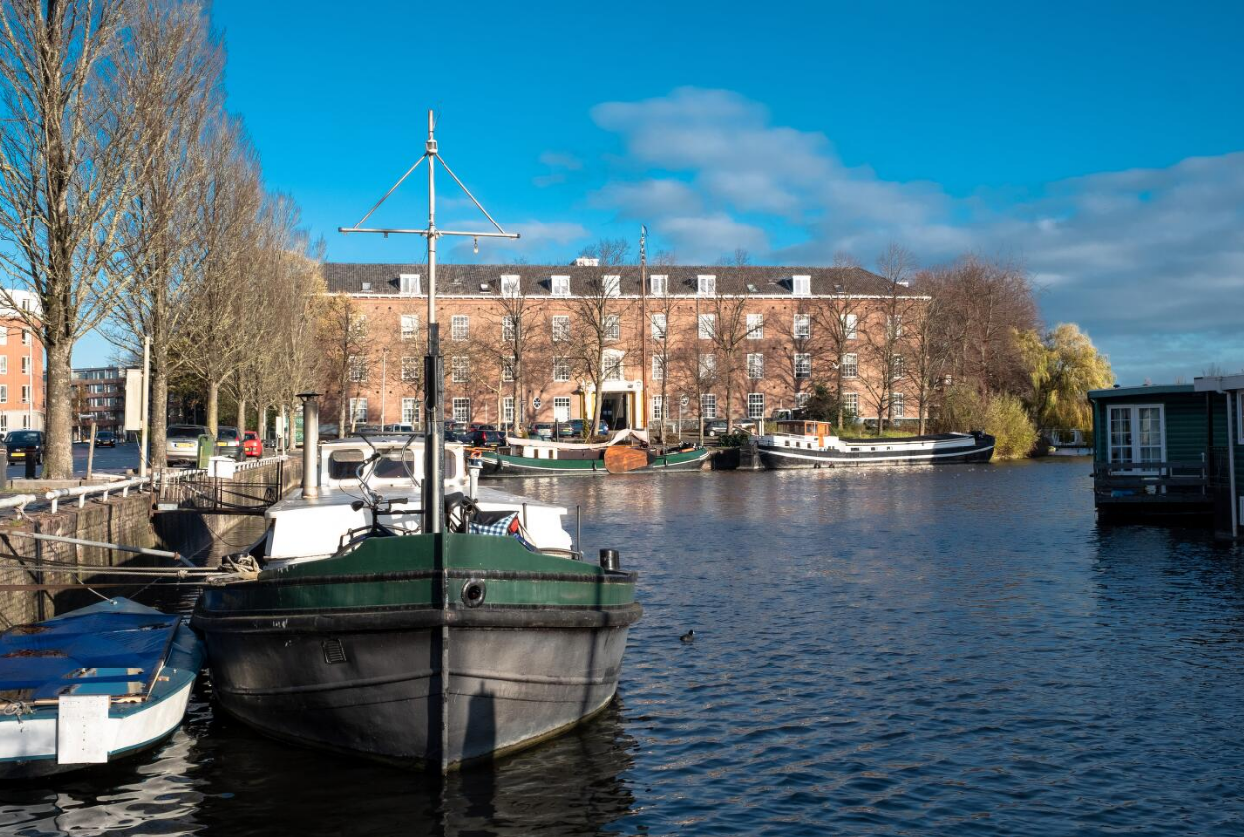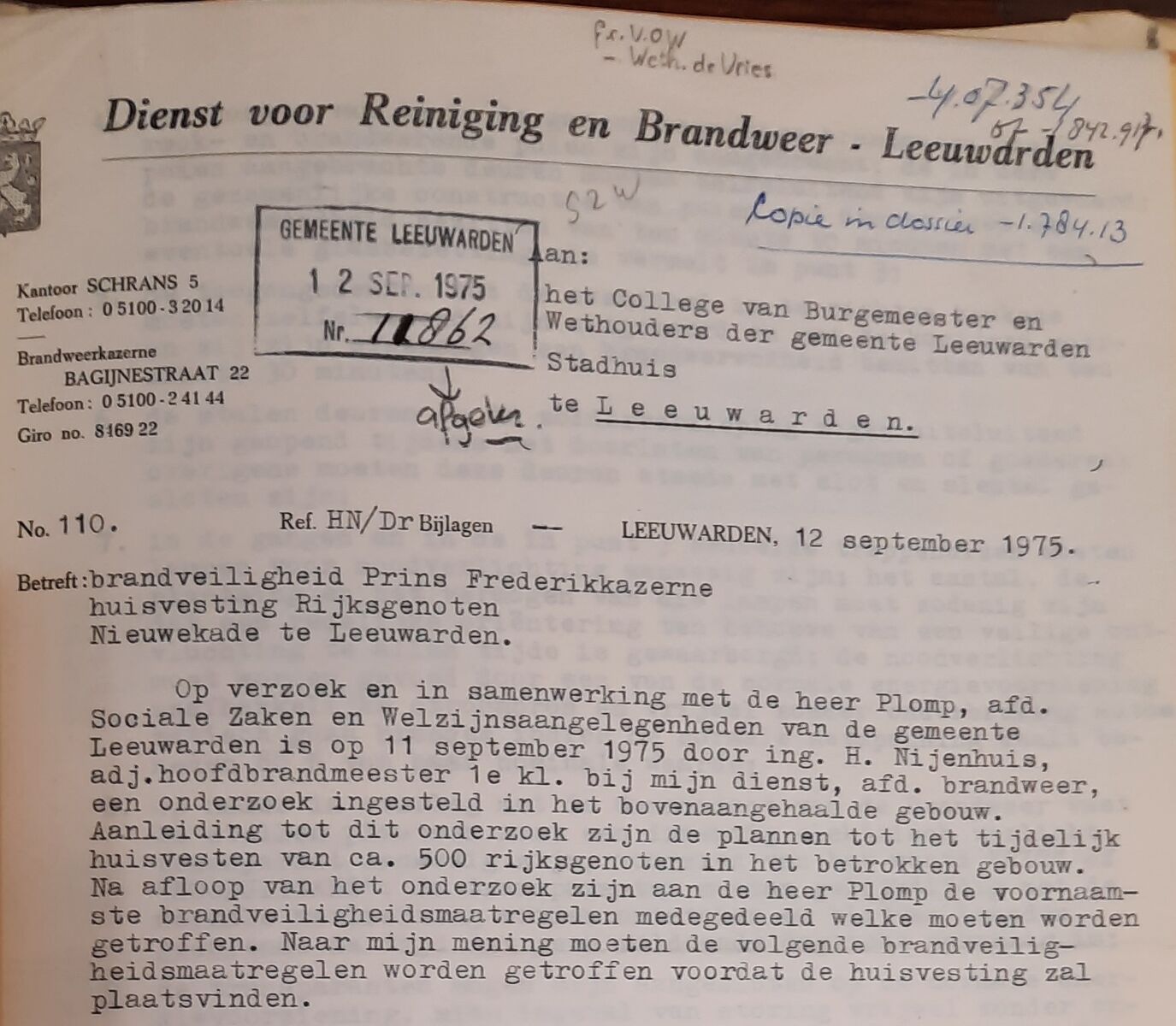 Zicht op de Prins Frederikkazerne aan de Amelandsdwinger te Leeuwarden. De foto is genomen vanaf de Vlietsterbrug over de Oostergracht.
