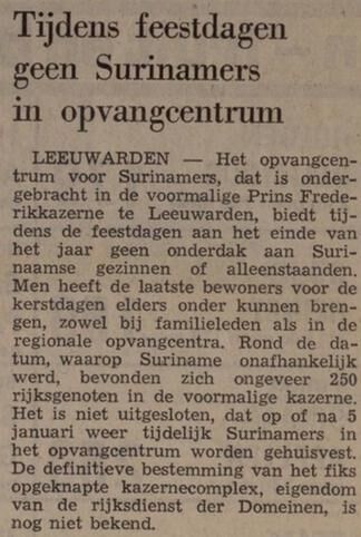 Sommige Surinaamse rijksgenoten besloten, na de onafhankelijkheid van Suriname in 1975, naar Nederland te verhuizen. Zij werden o.a. tijdelijk opgevangen in de Prins Frederikkazerne te Leeuwarden. Tijdens de feestdagen in december was het gelukt de mensen elders onder te brengen. Het was echter nog onduidelijk of de kazerne vanaf januari 1976 opnieuw Surinamers zou opvangen. Tegenwoordig zitten er in de voormalige kazerne sociale huurappartementen.