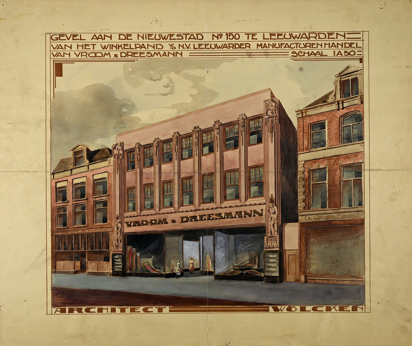 Ontwerptekening uit 1926 van de gevel van het warenhuis Vroom & Dreesmann aan de Nieuwestad 150 te Leeuwarden. In 2017 zijn de deuren gesloten en sindsdien zitten er andere winkels in het pand.